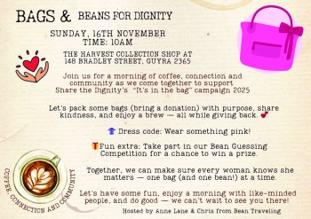 The Guyra community is invited to come together for a meaningful morning of generosity, connection, and coffee at the Bags and Beans for Dignity event on Saturday, 16th November from 10am at Harvest C...