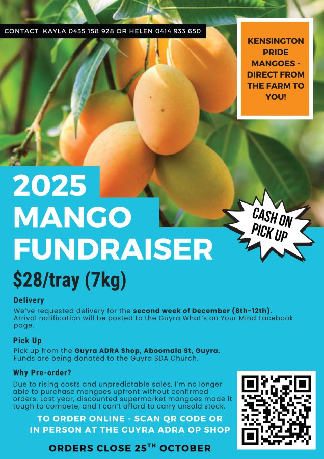 Organiser Kayla Turnham says pre-orders are now essential due to increasing demand and changing market conditions. The fundraiser only works when they know how many mangoes are truly wanted and can sell out, so pre orders are essential. The closing date is October 25th with delivery expected in the second week of December.