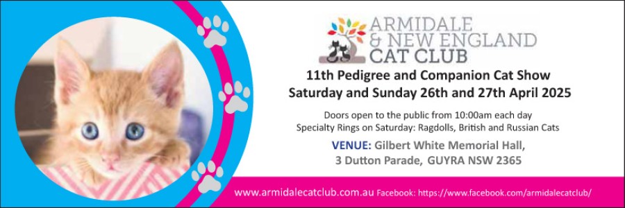 The 11th annual Armidale and New England Cat Club Pedigree and Companion Cat Show is purring its way to Guyra, with the event set to take place on Saturday and Sunday, April 26th and 27th at the Gilbert White Memorial Hall (Community Hall). The event has been transferred to Guyra due to hail damage at the usual Armidale venue.